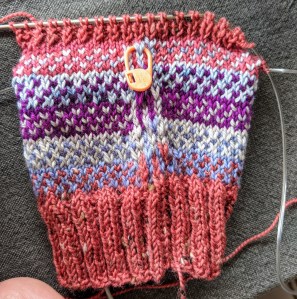 2.5 chart repeats then straight into the heel with MC. Knit the heel flap as written in what remained of the Tweed. Ran out 1 row short so resumed with CC5 Unnamed Red for the last row and the heel turn. It was fortunate as the Pickle & Co is loftier so will be more comfortable under the heel.
