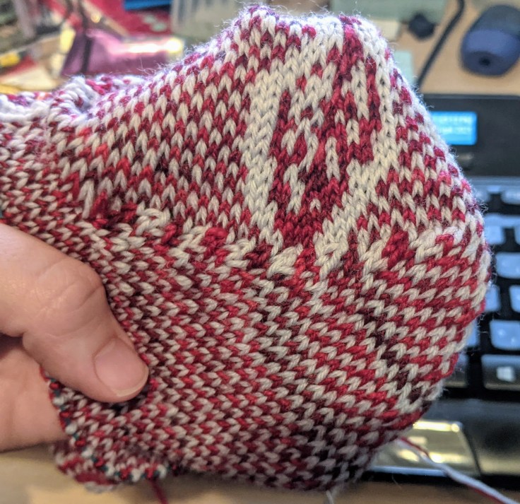If there’s a next time I’d definitely reduce leg chart repeats and keep to the decision to knit the brioche section on a smaller needle size. It does mean extra needles dangling from the work but it was worth it.