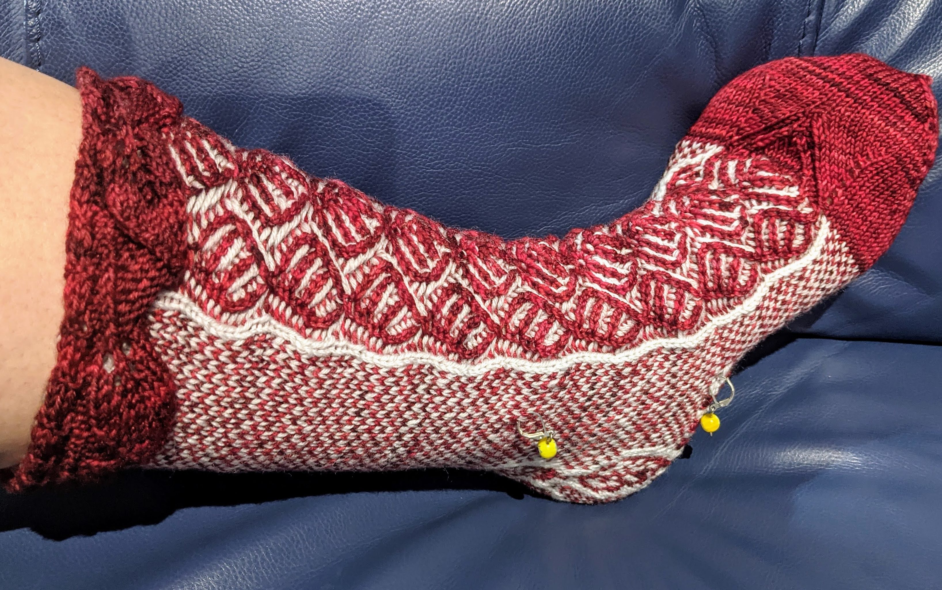 I feel it was an interesting choice for relatively early in the competition. In previous years a sock like this would appear much later in the game. I called my project What Big Beleaf You Have as a nod to the colourway name of my red indie yarn and also that it took an amount of self-belief and determination to get this project done, on time, to spec.