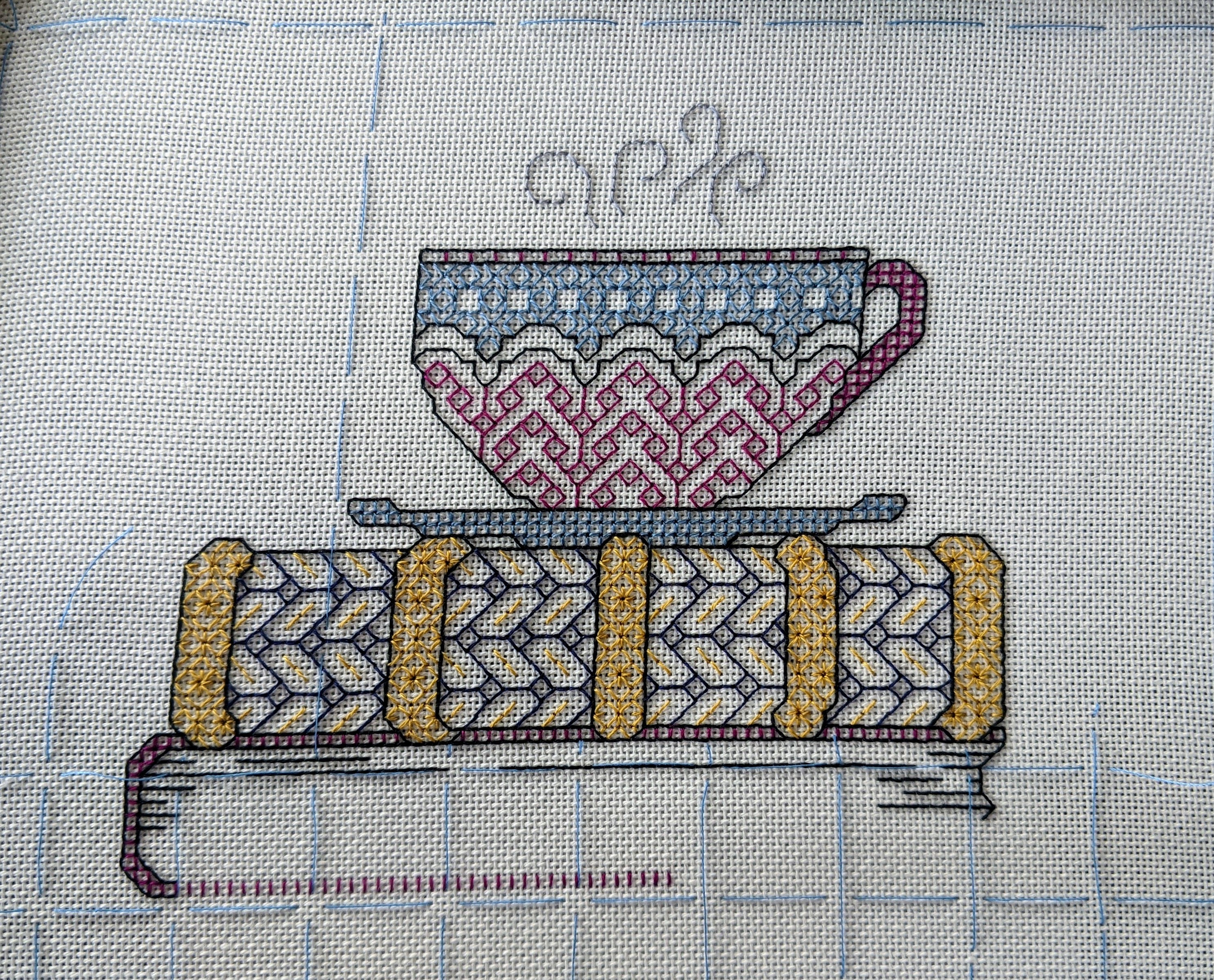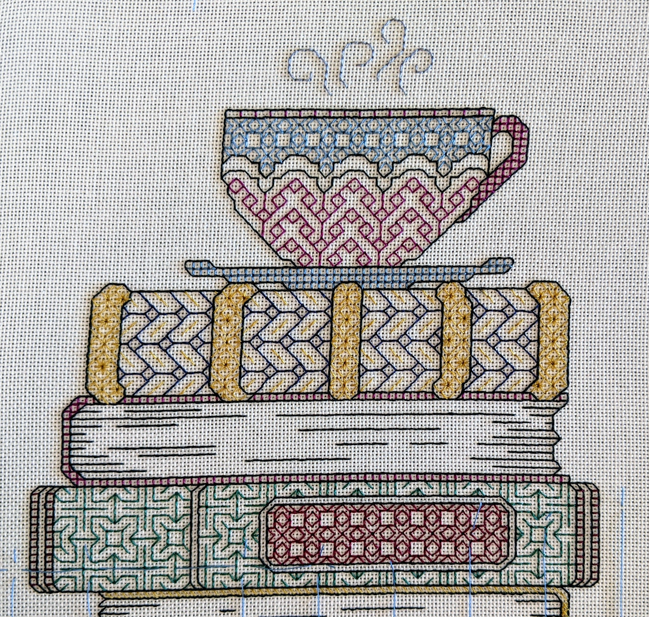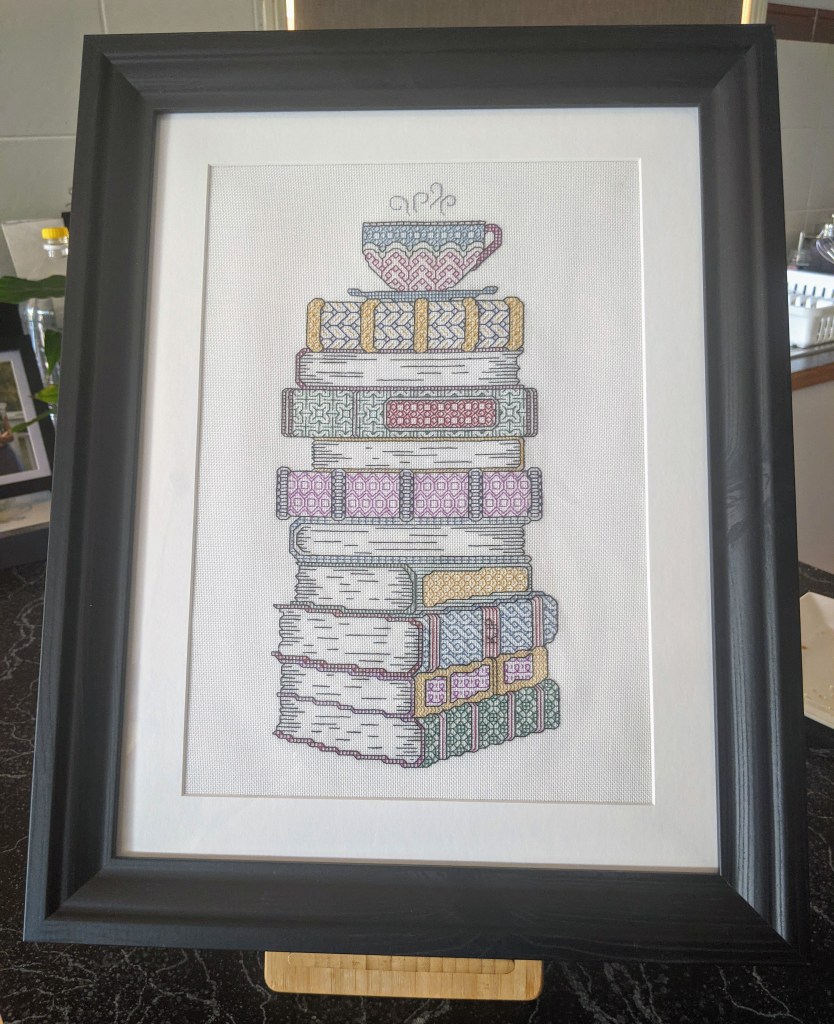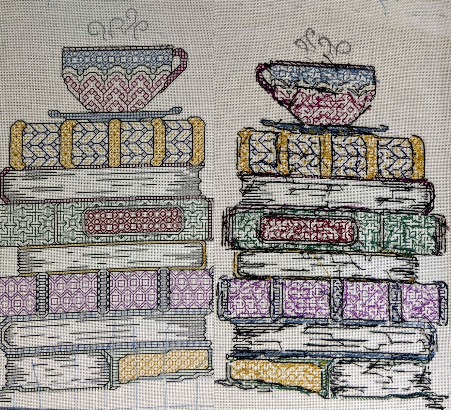 Aside from colour mods described above I also removed the pencil and left leaning book from the pattern. This was to make it of a size that would fit into my largest Q-Snap frame and also save me from having to move the frame around once the fabric was fixed in place. I also added a monogram to one of the books as a personalised touch that mirrors what my friend does with their diaries.