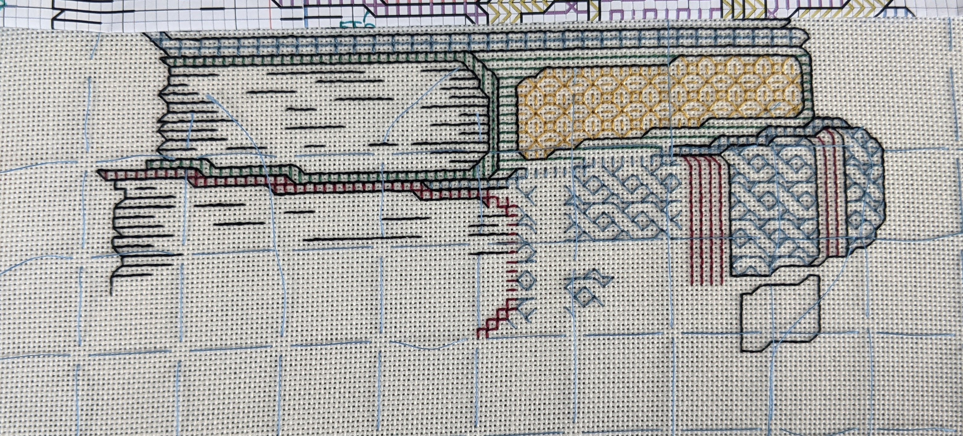 I modified some of the stitch designs of the thin edges to either put a colour in at all or alter the appearance by using slanted stitches instead of vertical ones.