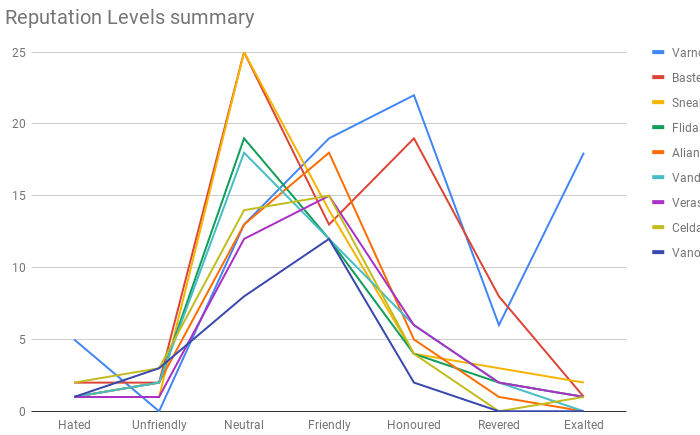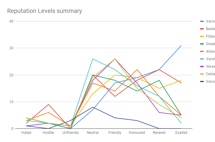 There’s been significant levelling of reputation happening for a couple of characters and others are sort of just getting pulled along with the tide. The red and yellow lines are largely due to crafting that needs particular reps to be very high to unlock recipes and appearances.